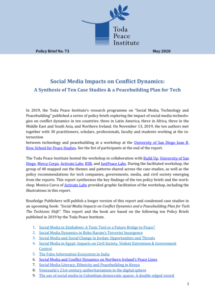 Routledge Publishers will publish a longer version of this report and condensed case studies in an upcoming book: “Social Media Impacts on Conflict Dynamics and a Peacebuilding Plan for Tech: The Techtonic Shift”. This report and the book are based on the following ten Policy Briefs published in 2019 by the Toda Peace Institute.