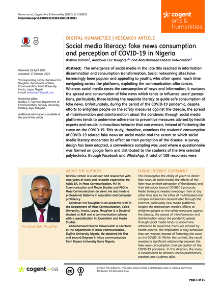 "The emergence of social media in the late 90s resulted in information dissemination and consumption transformation. Social networking sites have increasingly been popular and appealing to youths, who often spend much time navigating across the platforms, exploiting the communication affordances. Whereas social media eases the consumption of news and information, it nurtures the spread and consumption of fake news which tends to influence users' perceptions, particularly, those lacking the requisite literacy to guide safe consumption of fake news. Unfortunately, during the period of the COVID-19 pandemic, despite efforts to enlighten people on the safety measures against the disease, the spread of misinformation and disinformation about the pandemic through social media platforms tends to undermine adherence to preventive measures advised by health experts and results in incautious behavior that can worsen, instead of flattening the curve on the COVID-19. This study, therefore, examines the students' consumption of COVID-19 related fake news on social media and the extent to which social media literacy moderates its effect on their perception of the disease. A survey design has been adopted, a convenience sampling was used where a questionnaire was formed on google form and distributed to the students of the two selected polytechnics through Facebook and WhatsApp. A total of 108 responses were generated; thus, descriptive and T-test analyses were run and the result revealed that the students possess the requisite literacy to identify fake news on social media platforms, and that has a significant on their perception of COVID-19, despite consumption of fake news related to the disease based on the T-test p = 0.05. Therefore, the result suggests that the effectiveness of media literacy as inoculant moderates the effect of fake news, as asserted by the inoculation theorists, it has no bearing on the long established stereotypical notion that certain diseases are conspiracies to reduce the population of the world." (Abstract)