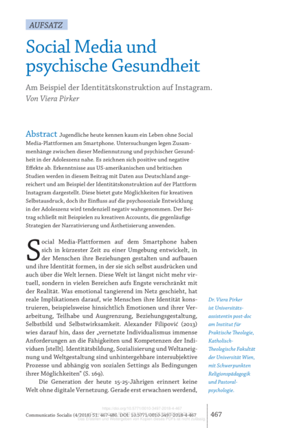 "Jugendliche heute kennen kaum ein Leben ohne Social Media-Plattformen am Smartphone. Untersuchungen legen Zusammenhänge zwischen dieser Mediennutzung und psychischer Gesundheit in der Adoleszenz nahe. Es zeichnen sich positive und negative Effekte ab. Erkenntnisse aus US-amerikanischen und britischen Studien werden in diesem Beitrag mit Daten aus Deutschland angereichert und am Beispiel der Identitätskonstruktion auf der Plattform Instagram dargestellt. Diese bietet gute Möglichkeiten für kreativen Selbstausdruck, doch ihr Einfluss auf die psychosoziale Entwicklung in der Adoleszenz wird tendenziell negativ wahrgenommen. Der Beitrag schließt mit Beispielen zu kreativen Accounts, die gegenläufige Strategien der Narrativierung und Ästhetisierung anwenden." (Zusammenfassung)
