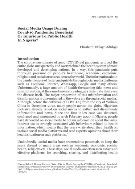 "Before the outbreak of COVID-19 from the city of Wuhan, China in December 2019, many people across the globe, Nigerians inclusive already relied on social media to gather and disseminate information and news. Since the outbreak of the virus on February 27th, 2020 in Nigeria, people have depended on social media to obtain information about the virus. No doubt, social media has a lot of potentials to keep the users abreast of many areas such as academic, economic, socials, health, religions etc. Nowadays, social media are often seen as fast and effective platforms for searching, sharing, and distributing health information among the general population. During sudden outbreaks such as the COVID-19 pandemic, the public needs access to timely, objective and reliable information about the disease symptoms, preventions and cure. Regrettably, these same platforms are also being deployed to spread fake news, rumours about the virus and cause fear, panic and death. Certainly, the scenario poses danger to both individual and public health in Nigeria. Based on this, the present article employed conceptual analysis with a receptor-oriented method to examine the extent to which the potential of social media can be beneficial or injurious to public health during the COVID-19 pandemic. It was discovered among others that; social media causes more harm to people’s health during the pandemic. Therefore, social media literacy and media content censorship among others were suggested as the way forward in promoting public health during a pandemic situation." (Abstract)