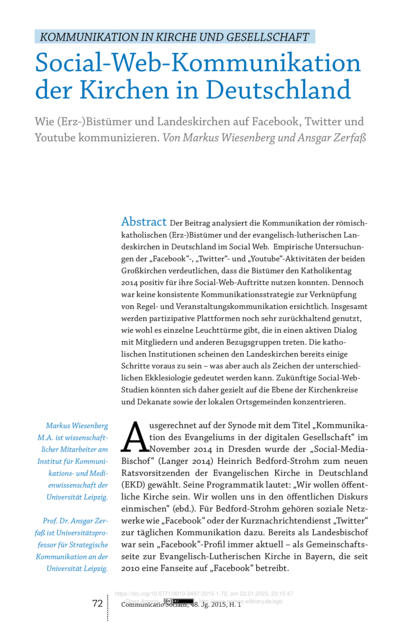 "Der Beitrag analysiert die Kommunikation der römisch-katholischen (Erz-)Bistümer und der evangelisch-lutherischen Landeskirchen in Deutschland im Social Web. Empirische Untersuchungen der „Facebook“-, „Twitter“- und „Youtube“-Aktivitäten der beiden Großkirchen verdeutlichen, dass die Bistümer den Katholikentag 2014 positiv für ihre Social-Web-Auftritte nutzen konnten. Dennoch war keine konsistente Kommunikationsstrategie zur Verknüpfung von Regel- und Veranstaltungskommunikation ersichtlich. Insgesamt werden partizipative Plattformen noch sehr zurückhaltend genutzt, wie wohl es einzelne Leuchttürme gibt, die in einen aktiven Dialog mit Mitgliedern und anderen Bezugsgruppen treten. Die katholischen Institutionen scheinen den Landeskirchen bereits einige Schritte voraus zu sein – was aber auch als Zeichen der unterschiedlichen Ekklesiologie gedeutet werden kann. Zukünftige Social-Web-Studien könnten sich daher gezielt auf die Ebene der Kirchenkreise und Dekanate sowie der lokalen Ortsgemeinden konzentrieren." (Abstract)