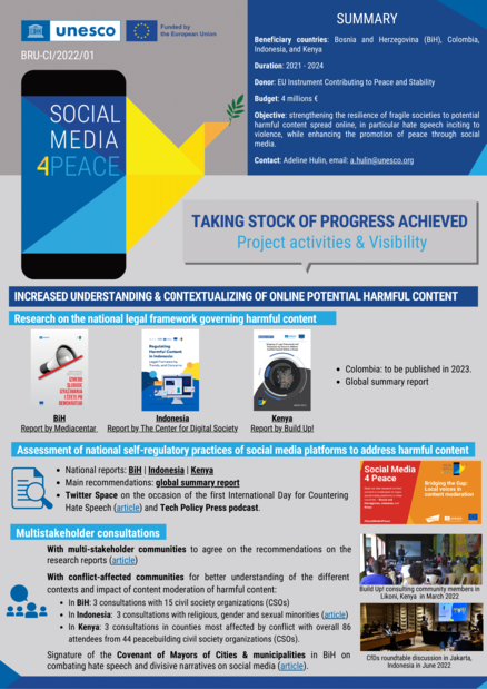 "The overall objective of this UNESCO project is to strengthen the resilience of societies to potentially harmful content spread online, in particular hate speech inciting violence while protecting freedom of expression and enhancing the promotion of peace through digital technologies, notably social media. The project runs from January 2021 - December 2023. There are four (4) pilot countries: Bosnia and Herzegovina, Colombia, Indonesia, and Kenya. The lessons learnt at the local level will feed-in for the global discussion at the international level." (Publisher description)