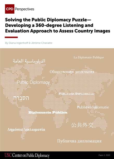 "In order to build good international relationships, Public Diplomacy (PD) requires a precise and complete understanding of who and what makes up a country’s image. However, previous research lacks a theoretical and methodological framework that allows for the systematic collection and analysis of the opinions of foreign publics to analyze the whole picture of a country. This study discusses the concept of public opinion and country image formation and takes into consideration different measurement models. On this basis, a new, innovative, integrative country image listening and measurement instrument for public diplomacy is introduced. The new model integrates different components of country image and highlights the importance of formative and summative evaluation, while considering contextual factors influencing country image formation. This instrument allows the strategic analysis of how public diplomacy communication and various publics contribute to the formation of country images. We demonstrate the value of the integrated country image measurement instrument by analyzing the Swiss country image via a multimethod approach, principally through analyzing and integrating data from public opinion survey studies, international news coverage and Google Trends as a way to assess the international perception of a country. First, on the output level, we analyze high reach media outlets in five countries (Germany, France, Italy, UK, and US) with a codebook that allows for analysis of the news agenda about Switzerland in the countries abroad with respect to the five country image dimensions. Second, on the outcome level, we use a survey study in the five countries, combining a standardized instrument for measuring country image with open survey questions about general associations, strengths, weaknesses and recalled news media surrounding Switzerland. In addition, we use structural equation modeling to calculate the value drivers of the Swiss country image, to find out what the key components that shape the country image dimensions are. In order to look at conative outcomes, we further analyze google searches in the respective countries, as trace data can give empirical proofs for the statements of respondents and bring valuable insights on digital media as a new information source. Finally, we analyze the overall country reputation in each of the countries and align the results with the content analysis and survey studies. The study gives public diplomacy actors valuable insights into the use of mixed method approaches when measuring country images and exploring the importance of “listening” and so giving special attention to different types of publics, units and research methods." (Abstract)