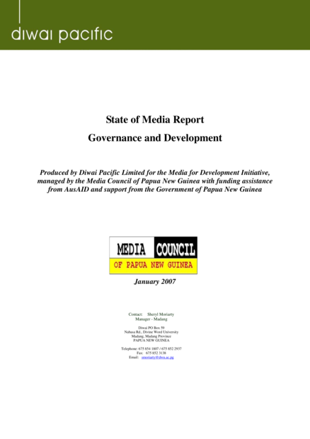 "The state of the media report consists of two parts: a media content analysis and a media and civil society organisation (CSO) data survey. The media content analysis deals with news, current affairs, and documentary content produced by a sample of Papua New Guinea (PNG) media organisations that use radio, print and television for the purpose of disseminating content on governance and development. The content analysis involved an intensive three-week period of data collection and coding of material from 23 different media, government departments/agencies and CSOs. The second stream of the project involved a media, government department/agency and CSO data survey of organisations that produce media content on governance and development. This database will provide MDI with information on the capacity of these organisations to produce media content (print, radio, television, video, and online) for governance and development." (Introduction, page 7)