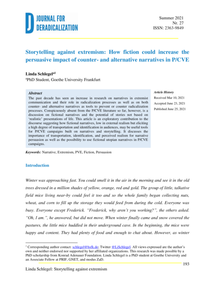 "The past decade has seen an increase in research on narratives in extremist communication and their role in radicalization processes as well as on both counter- and alternative narratives as tools to prevent or counter radicalization processes. Conspicuously absent from the P/CVE literature so far, however, is a discussion on fictional narratives and the potential of stories not based on ‘realistic’ presentations of life. This article is an exploratory contribution to the discourse suggesting how fictional narratives, low in external realism but eliciting a high degree of transportation and identification in audiences, may be useful tools for P/CVE campaigns built on narratives and storytelling. It discusses the importance of transportation, identification, and perceived realism for narrative persuasion as well as the possibility to use fictional utopian narratives in P/CVE campaigns." (Abstract)