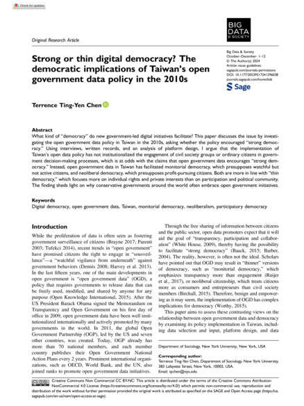 "What kind of “democracy” do new government-led digital initiatives facilitate? This paper discusses the issue by investigating the open government data policy in Taiwan in the 2010s, asking whether the policy encouraged “strong democracy.” Using interviews, written records, and an analysis of platform design, I argue that the implementation of Taiwan’s open data policy has not institutionalized the engagement of civil society groups or ordinary citizens in government decision-making processes, which is at odds with the claims that open government data encourages “strong democracy.”Instead, open government data in Taiwan has facilitated monitorial democracy, which presupposes watchful but not active citizens, and neoliberal democracy, which presupposes profit-pursuing citizens. Both are more in line with “thin democracy,” which focuses more on individual rights and private interests than on participation and political community. The finding sheds light on why conservative governments around the world often embrace open government initiatives." (Abstract)