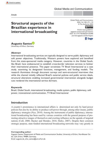 "International broadcasting services are typically designed to serve public diplomacy and soft power objectives. Traditionally, Western powers have explored and benefited from this state-sponsored media category. However, countries in the Global South, like Brazil, have endeavoured to establish cross-border television services to bolster their international presence. This paper scrutinizes TV Brasil Internacional as a case study, examining its designated functions, management, and funding models. The research illuminates through document surveys and semi-structured interviews that while the channel initially reflected Brazil’s external policies and public service ideals, structural alterations enabling increased governmental intervention alongside budget cuts rendered the international service dormant." (Abstract)