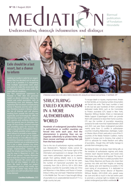 "Hundreds of endangered journalists living in authoritarian or conflict countries are forced into exile each year. And the phenomenon is growing. How can we organize collectively to protect them, help them recover and keep on doing their job from the host country?" (Page 1)