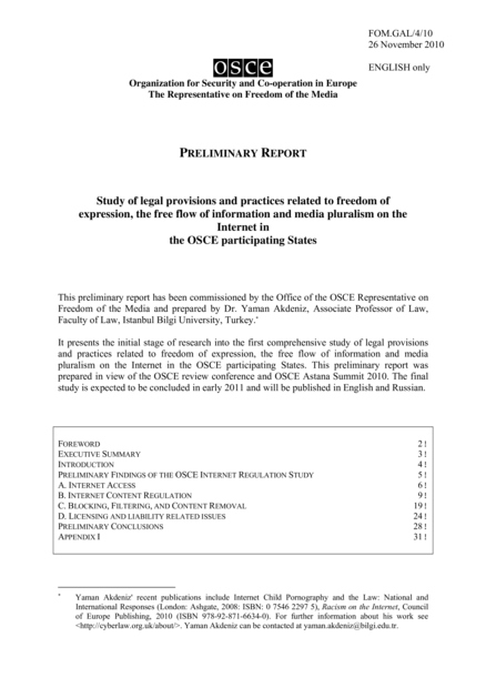 Study of Legal Provisions and Practices Related to Freedom of Expression, the Free Flow of Information and Media Pluralism on the Internet in the OSCE Participating States