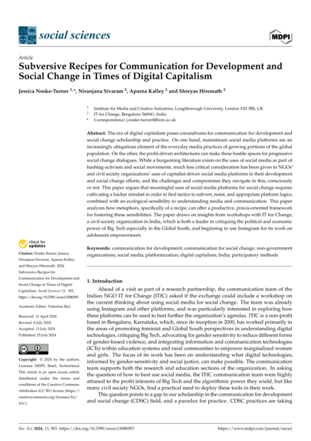 "The era of digital capitalism poses conundrums for communication for development and social change scholarship and practice. On one hand, mainstream social media platforms are an increasingly ubiquitous element of the everyday media practices of growing portions of the global population. On the other, the profit-driven architectures can make these hostile spaces for progressive social change dialogues. While a burgeoning literature exists on the uses of social media as part of hashtag-activism and social movements, much less critical consideration has been given to NGOs’and civil society organizations’ uses of capitalist-driven social media platforms in their development and social change efforts, and the challenges and compromises they navigate in this, consciously or not. This paper argues that meaningful uses of social media platforms for social change requires cultivating a hacker mindset in order to find tactics to subvert, resist, and appropriate platform logics, combined with an ecological sensibility to understanding media and communication. This paper analyzes how metaphors, specifically of a recipe, can offer a productive, praxis-oriented framework for fostering these sensibilities. The paper draws on insights from workshops with IT for Change, a civil society organization in India, which is both a leader in critiquing the political and economic power of Big Tech especially in the Global South, and beginning to use Instagram for its work on adolescent empowerment." (Abstract)
