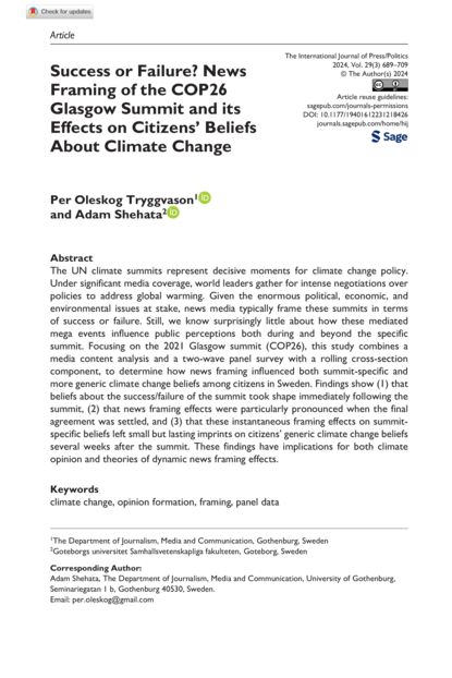 "The UN climate summits represent decisive moments for climate change policy. Under significant media coverage, world leaders gather for intense negotiations over policies to address global warming. Given the enormous political, economic, and environmental issues at stake, news media typically frame these summits in terms of success or failure. Still, we know surprisingly little about how these mediated mega events influence public perceptions both during and beyond the specific summit. Focusing on the 2021 Glasgow summit (COP26), this study combines a media content analysis and a two-wave panel survey with a rolling cross-section component, to determine how news framing influenced both summit-specific andmore generic climate change beliefs among citizens in Sweden. Findings show (1) that beliefs about the success/failure of the summit took shape immediately following the summit, (2) that news framing effects were particularly pronounced when the final agreement was settled, and (3) that these instantaneous framing effects on summitspecific beliefs left small but lasting imprints on citizens’ generic climate change beliefs several weeks after the summit. These findings have implications for both climate opinion and theories of dynamic news framing effects." (Abstract)