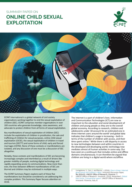 "As the boundaries between the physical and digital worlds continue to blur, particularly for children growing up in the digital age, online child sexual exploitation (OCSE) will continue to evolve and new forms emerge. Encouragingly, work is underway at national and international levels to prevent and respond to this global threat, but innovative and substantial actions are needed to keep up with this evolving problem. Legal frameworks must improve and approximate global consistency and regulation must make tech companies and Internet Service Providers accountable for action. Law enforcement must collaborate across jurisdictions, adopt sophisticated techniques and be properly equipped and funded. There is an urgent need to further boost and sustain collective action against OCSE at this moment in time. ECPAT International has identified in this paper five areas where progress can and must be made. Again, as this problem is not confined by borders, strategic partnerships with the involvement of an increasing number of global actors will be instrumental in making this happen. As a society, we have a duty and a responsibility to stop the demand underpinning OCSE and ensure the rights of children online and offline are fulfilled." (Conclusion, page 23)