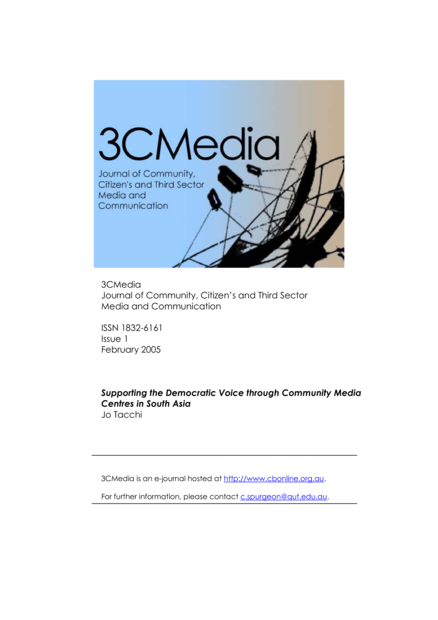"This paper considers the potential of community based information and communication technology (ICT) centres to support and promote the democratic voice. It does so through presenting comparative research findings from eight ICT centres in South Asia. The research uses a methodology that combines ethnographic approaches with action research. Here I look at the notion of ‘democratic voice’ in a loosely defined sense, referring to the ability of ‘ordinary’ people to access media and other information and communication technologies, and to create their own local content. As such it describes to some extent the processes of ‘metamorphosis’ involved in ‘citizen’s media’ participants becoming, through these activities, ‘active citizens’ (Rodriguez 2004). At a point in time when alternative media studies are recognising a new relevance and development communication research facing a crisis in direction, this paper considers research findings emerging from and utilised in community based ICT initiatives across South Asia. Looking at the research in a comparative framework, lessons can be learned about the relevance of community media for supporting democratic voice, and the processes that are most likely to achieve this." (Abstract)