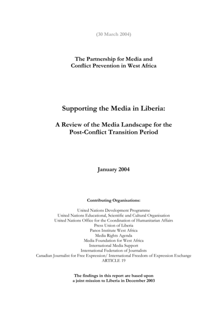 "This report outlines the findings and conclusions derived from the assessment mission undertaken by the ‘Partnership for Media and Conflict Prevention in West Africa’ to Liberia in December 2003. This mission brought together the expertise of a number of the national, regional and international media development and freedom of expression actors. The report seeks to layout collaborative approaches for supporting the media during the immediate and longer-term transition periods, both in terms of overcoming obstacles and developing capacities and resources, as well as contributing towards the creation of lasting peace, stability and democracy." (Executive summary, page 3)