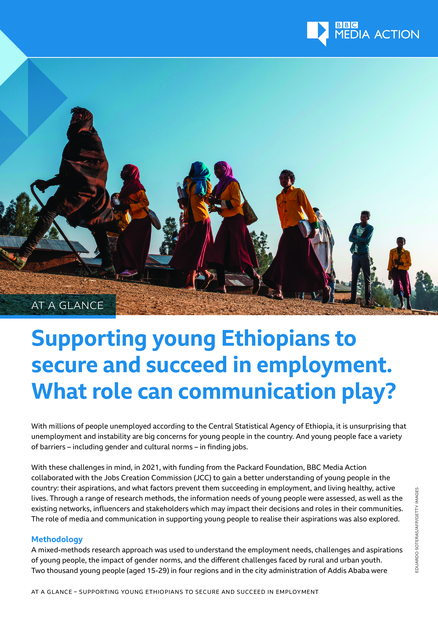 "Based on this research, it was found that media and communication interventions could seek to leverage young Ethiopians’ optimism and enthusiasm, providing informative and inspiring content to fuel their ideas. This insight informed the creation of a social and behaviour change (SBCC) strategy to engage young people in the workforce, developed in partnership with the Ethiopia Jobs Creation Commission (JCC). The strategy identifies two key priority segments that need significant support - the ‘progressive but held back’ and the ‘unengaged and unambitious.’ Priority audiences across these two segments are younger 15- 18 year olds, men and women who are less educated more likely to marry before the age of 21. Creating an enabling environment to help these groups, while keeping in mind the needs of the others, is central to this strategy. Pilot media content will now be produced to support JCC as they deliver the overall communication strategy. This content will address the needs of priority groups by giving information about job opportunities, using role models and real life stories to inspire and address traditional gender norms." (Page 3)