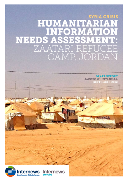 "Internews surveyed more than 120 Syrian refugees in Zaatari camp, asking a set of 30 questions about information needs, sources, and trust levels. Additionally, 20 in-depth key informant interviews were conducted with humanitarian workers and media professionals in Jordan and in Beirut, Lebanon. As per the rapid assessment, many refugees in the camp are frustrated by their increasing ignorance of their current situation, the lack of adequate access to news and information about the situation in Syria, the quality of services available in the camp, and the lack of information about the very same services available. First and foremost, refugees demand news and information about Syria. This is followed by the need to know how to access basic services particularly with regard to water, food and new shelter (i.e. caravans). Residents also want to know information about their general situation in the camp. The overwhelming majority of refugees affirmed satellite TV was the source of information they trusted the most when there were at home in Syria – Al Jazeera Arabic and Al Arabiya being the preferred channels. In Zaatari, TV is the source refugees would like to access for news about Syria as well as for entertainment. After TV, mobile phones and Internet were ranked among the three most trusted sources." (Summary)