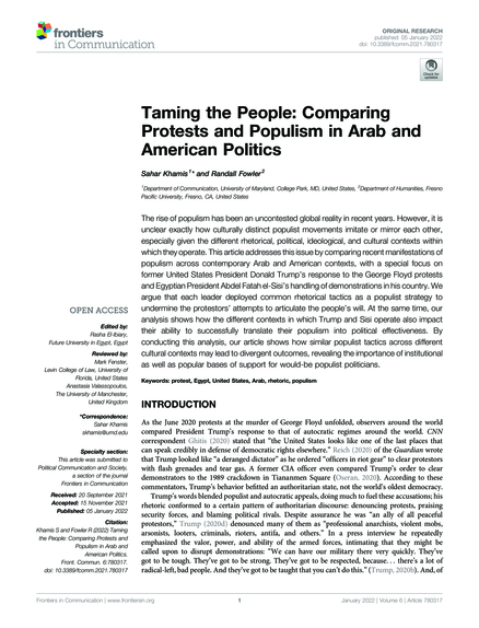 "The spread of social media platforms ushered the beginning of an unprecedented communication era, which is borderless, immediate, widespread, and defies restrictions and censorship. Digital technology aided the spread of democracy and freedom of expression and helped to overthrow some Arab regimes in 2011. At that time, it was believed that these platforms paved the way for democracy by allowing citizens to easily circumvent governmental censorship, and by facilitating communication, networking, and organization among activists, thus weakening authoritarian regimes. These assumptions were overly optimistic, as the detours in democratization and political reform in the Arab region over a decade later illustrate. This article tackles the exploitation of new media, and the laws and regulations governing them, by Arab authoritarian regimes to crack down on opponents, activists, and journalists, oftentimes under the mantle of fighting disinformation, using a plethora of techniques. It also illustrates how disinformation could spread rapidly through governmentally orchestrated campaigns via new communication tools, causing serious political consequences and high risks to activists and journalists, while aiding counter revolutions. The constraining implications of these complex phenomena on Arab journalism will be explored, especially in the aftermath of the COVID-19 pandemic." (Abstract)