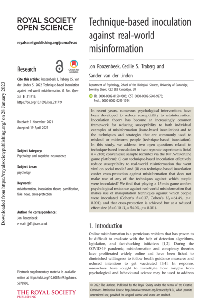 "In recent years, numerous psychological interventions have been developed to reduce susceptibility to misinformation. Inoculation theory has become an increasingly common framework for reducing susceptibility to both individual examples of misinformation (issue-based inoculation) and to the techniques and strategies that are commonly used to mislead or misinform people (technique-based inoculation). In this study, we address two open questions related to technique-based inoculation in two separate experiments (total n = 2188; convenience sample recruited via the Bad News online game platform): (i) Can technique-based inoculation effectively reduce susceptibility to real-world misinformation that went viral on social media? And (ii) can technique-based inoculation confer cross-protection against misinformation that does not make use of any of the techniques against which people were inoculated? We find that playing a 15 min game confers psychological resistance against real-world misinformation that makes use of manipulation techniques against which people were inoculated (Cohen’s d = 0.37, Cohen’s U3 = 64.4%, p <0.001), and that cross-protection is achieved but at a reduced effect size (d = 0.10, U3 = 54.0%, p = 0.001)." (Abstract)