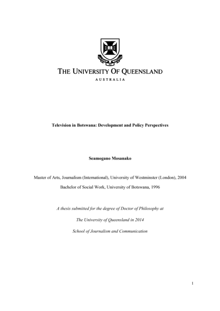 "A national television service, Botswana Television (Btv) was introduced in 2000 by the Botswana Government. However, Btv’s role in national development has received limited research attention. This study examines the role of television in national development in Botswana. In addition, the study explores the factors that influence the performance of television in a developing country context, with a view to suggest issues for consideration in media policy in Botswana to improve the performance of the Btv [...] The study illustrates that the role of television in national development in Botswana is mostly consistent with the role of the media advocated by the modernisation theory of development communication. The roles of Btv in this regard are education, information, entertainment and dissemination of government information. Most research participants in this study shared a common understanding that Btv should be a medium for diffusing development ideas initiated by the Botswana Government, for possible adoption by the public. Other roles of Btv relate to countering the dominance of neighbouring South Africa media content in Botswana, as well as contributing to Botswana’s economic diversification through advertising. The positive factors that validate the applicability of modernisation theory in the analysis of Btv include planning for the introduction of the service, improved transmission signal access, diverse programs that have been aimed at addressing developmental issues such as health, education and agriculture, and the use of the national language. Nonetheless, Btv audiences complained about limited cultural content on the channel. A political economy analysis of the factors influencing the performance of Btv revealed that the absence of a formal media policy framework has exacerbated the political and economic pressures facing Btv, such as state control and limited funding. This study therefore proposes that there is a need for the Botswana Government to introduce appropriate media policy with more emphasis on issues relating to its broadcasting model, objectives, funding, and programming with a view to strengthening and positioning Btv to realise its full potential in contributing to national development in Botswana." (Abstract, page 2-3)