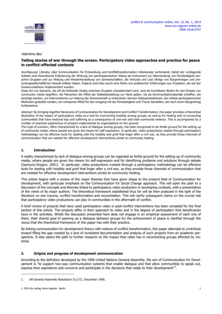 "By bringing together literatures of Communication for Development and Conflict Transformation, this paper provides a theoretical illustration of the impact of participatory video as a tool for overcoming hostility among groups, as well as for healing and re-connecting communities that have endured loss and suffering as a consequence of civil war and inter-communal violence. This is accompanied by a number of practical experiences of projects implemented by organizations on the ground. This type of scenario, often characterized by a lack of dialogue among groups, has been recognized to be fertile ground for the setting up of community media, where people are given the means for self-expression. In particular, video productions created through participatory methodology can be effective tools for dealing with the hostility and grief that linger after a civil war, as they provide those channels of communication that are needed for effective development interventions aimed at community healing." (Abstract)