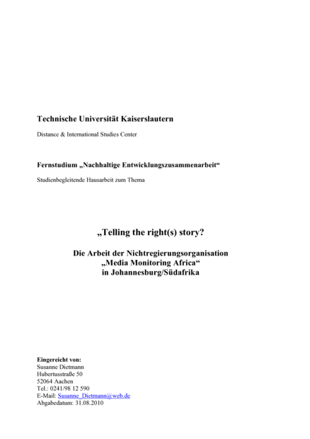 Kaiserslautern: Technische Universität, Fernstudium „Nachhaltige Entwicklungszusammenarbeit“, Hausarbeit (2010), 38 pp.