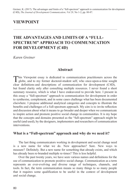 "This Viewpoint essay is dedicated to communication practitioners across theglobe, and to my former doctoral-student self, who once-upon-a-time sought clear definitions and descriptions of communication for development (C4D), but found clarity only after consulting multiple resources. I never found a short summary resource, which is what I have endeavored to provide here. I present in this essay a “full-spectrum” approach to communication for development in order to synthesise, complement, and in some cases challenge what has been documented elsewhere. I propose additional analytical categories and concepts to illustrate the benefits and challenges of a full-spectrum approach. My aim is to invite reflection and discussion about what it means to go broader and deeper when we communicate to inspire action and promote positive social change in communities. It is my hope that the concepts and domains presented as the “full-spectrum” approach might be useful (and used), by the designers, implementers and researchers of communication interventions." (Abstract)
