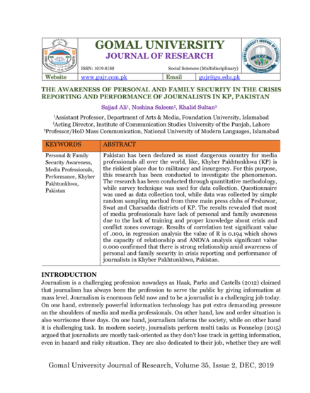 "Pakistan has been declared as most dangerous country for media professionals all over the world, like, Khyber Pakhtunkhwa (KP) is the riskiest place due to militancy and insurgency. For this purpose, this research has been conducted to investigate the phenomenon. The research has been conducted through quantitative methodology, while survey technique was used for data collection. Questionnaire was used as data collection tool, while data was collected by simple random sampling method from three main press clubs of Peshawar, Swat and Charsadda districts of KP. The results revealed that most of media professionals have lack of personal and family awareness due to the lack of training and proper knowledge about crisis and conflict zones coverage. Results of correlation test significant value of .000, in regression analysis the value of R is 0.194 which shows the capacity of relationship and ANOVA analysis significant value 0.000 confirmed that there is strong relationship amid awareness of personal and family security in crisis reporting and performance of journalists in Khyber Pakhtunkhwa, Pakistan." (Abstract)