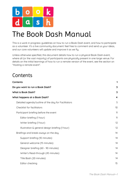 "We believe every child should own a hundred books by the age of five. In South Africa, that means giving 600 million free books to children who could never afford to buy them. Every day we lose, more children grow up unable to read and write well, and to enjoy the worlds that books open up. Every one of us can help to give lots of free books to very young children. Most importantly, these books should be: new, African stories; with characters they recognise; in languages they speak; beautiful enough to love for a lifetime. There are two sides to getting new, better books into children's hands: 1. Book creation: writing, illustration and design, guided by an editor (Output: print and digital files than anyone can download and share); 2. Book distribution: printing, delivering and handing out to children and parents (This includes reading on mobile phones). Book Dash creates books. We support others in distributing them to children. Our book-creation process is where our name comes from: a Book Dash is a single day when volunteer teams of skilled creative professionals come together to create new children's storybooks in just 12 hours. Each team comprises a writer, an illustrator, and a designer. The teams have twelve hours to create one book per team. We provide expert editors, tech support, a great venue, great food and lots of coffee." (Page 3-4)