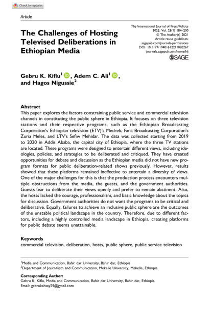 "This paper explores the factors constraining public service and commercial television channels in constituting the public sphere in Ethiopia. It focuses on three television stations and their respective programs, such as the Ethiopian Broadcasting Corporation’s Ethiopian television (ETV)’s Medrek, Fana Broadcasting Corporation’s Zuria Meles, and LTV’s Sefiw Mehidar. The data was collected starting from 2019 to 2020 in Addis Ababa, the capital city of Ethiopia, where the three TV stations are located. These programs were designed to entertain different views, including ideologies, policies, and strategies to be deliberated and critiqued. They have created opportunities for debate and discussion as the Ethiopian media did not have new program formats for public deliberation-related shows previously. However, results showed that these platforms remained ineffective to entertain a diversity of views. One of the major challenges for this is that the production process encounters multiple obstructions from the media, the guests, and the government authorities. Guests fear to deliberate their views openly and prefer to remain abstinent. Also, the hosts lacked the courage, professionalism, and basic knowledge about the topics for discussion. Government authorities do not want the programs to be critical and deliberative. Equally, failures to achieve an inclusive public sphere are the outcomes of the unstable political landscape in the country. Therefore, due to different factors, including a highly controlled media landscape in Ethiopia, creating platforms for public debate seems unattainable." (Abstract)