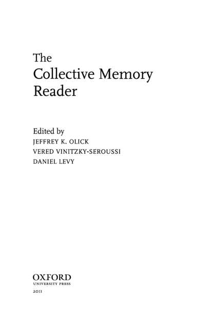 "The Collective Memory Reader presents, organizes, and evaluates past work and contemporary contributions on collective memory. Combining seminal texts, hard-to-find classics, previously untranslated references, and contemporary landmarks, it will serve as a key reference in the field. In addition to a thorough introduction, which outlines a useful past for contemporary memory studies, The Collective Memory Reader includes five sections-Precursors and Classics; History, Memory, and Identity; Power, Politics, and Contestation; Media and Modes of Transmission; Memory, Justice, and the Contemporary Epoch-comprising ninety-one texts. A short editorial essay introduces each of the sections, while brief capsules frame each of the selected texts." (Publisher description)