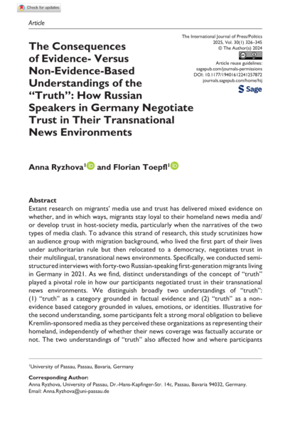 "Extant research on migrants’ media use and trust has delivered mixed evidence on whether, and in which ways, migrants stay loyal to their homeland news media and/or develop trust in host-society media, particularly when the narratives of the two types of media clash. To advance this strand of research, this study scrutinizes how an audience group with migration background, who lived the first part of their lives under authoritarian rule but then relocated to a democracy, negotiates trust in their multilingual, transnational news environments. Specifically, we conducted semistructured interviews with forty-two Russian-speaking first-generation migrants living in Germany in 2021. As we find, distinct understandings of the concept of “truth” played a pivotal role in how our participants negotiated trust in their transnational news environments. We distinguish broadly two understandings of “truth”: (1) “truth” as a category grounded in factual evidence and (2) “truth” as a nonevidence based category grounded in values, emotions, or identities. Illustrative for the second understanding, some participants felt a strong moral obligation to believe Kremlin-sponsored media as they perceived these organizations as representing their homeland, independently of whether their news coverage was factually accurate or not. The two understandings of “truth” also affected how and where participants sought for what they considered the “truth.” In the “Discussion” section, we argue that particularly the non-evidence-based truth-understandings formulated by our participants, and the ensuing truth-seeking strategies are conducive to the reach and persuasive impact of Kremlin-sponsored content among Russian speakers living abroad." (Abstract)