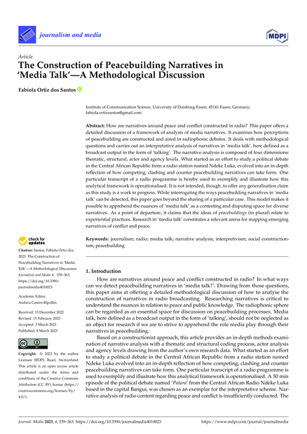 "How are narratives around peace and conflict constructed in radio? This paper offers a detailed discussion of a framework of analysis of media narratives. It examines how perceptions of peacebuilding are constructed and aired in radiophonic debates. It deals with methodological questions and carries out an interpretative analysis of narratives in ‘media talk’, here defined as a broadcast output in the form of ‘talking’. The narrative analysis is composed of four dimensions: thematic, structural, actor and agency levels. What started as an effort to study a political debate in the Central African Republic from a radio station named Ndeke Luka, evolved into an in-depth reflection of how competing, clashing and counter peacebuilding narratives can take form. One particular transcript of a radio programme is hereby used to exemplify and illustrate how this analytical framework is operationalised. It is not intended, though, to offer any generalisation claim as this study is a work in progress. While interrogating the ways peacebuilding narratives in ‘media talk’ can be detected, this paper goes beyond the sharing of a particular case. This model makes it possible to apprehend the nuances of ‘media talk’ as a contesting and disputing space for diverse narratives. As a point of departure, it claims that the ideas of peacebuildings (in plural) relate to experiential practices. Research in ‘media talk’ constitutes a relevant arena for mapping emerging narratives of conflict and peace." (Abstract)