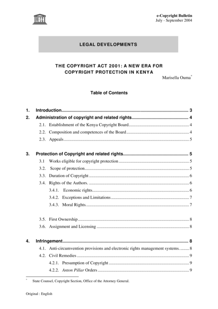 "A comprehensive review of the new Kenya 2001 Copyright Act, which was passed by the Kenyan Parliament, after several rounds of consultations between the government and the different stakeholders and industry players. It came into force in February 2003 and repealed the 1966 Copyright Act. The most distinctive new features of the new Copyright Act include the introduction of an anti-piracy security device; the registration and supervision of collective management societies in Kenya; the appointment of public prosecutors and inspectors who deal with copyright cases and help the enforcement of the rights protected under the Act; the provision of enhanced criminal sanctions; and the protection of rights management systems and technological protection measures. The author welcomes the 2001 Copyright Act as a step in the right direction, yet “the success of the new law can only be seen if it is effectively enforced; a good law without the proper enforcement is of no use to those it seeks to protect. Along with the new law, Kenya needs to have strong mechanisms to fight piracy, a well educated population on matters of copyright and related rights, strong and efficient collective management societies, and a functional administrative infrastructure." (Hans M. Zell, Publishing, Books & Reading in Sub-Saharan Africa, 3d ed. 2008, nr. 1797)