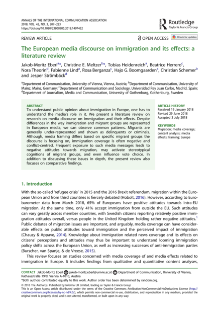 "To understand public opinion about immigration in Europe, one has to understand the media’s role in it. We present a literature review on research on media discourse on immigration and their effects. Despite differences in the way immigration and migrant groups are represented in European media, we can observe common patterns. Migrants are generally under-represented and shown as delinquents or criminals. Although, media framing differs based on specific migrant groups the discourse is focusing on, immigration coverage is often negative and conflict-centred. Frequent exposure to such media messages leads to negative attitudes towards migration, may activate stereotypical cognitions of migrant groups, and even influence vote choice. In addition to discussing these issues in depth, the present review also focuses on comparative findings." (Abstract)