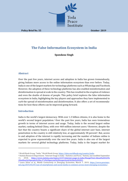"Over the past few years, internet access and adoption in India has grown tremendously, giving Indians more access to the online information ecosystem than ever before. Today, India is one of the largest markets for technology platforms such as WhatsApp and Facebook. However, the adoption of these technology platforms has also enabled misinformation and disinformation to spread at scale in the country. This has resulted in the eruption of violence and even the deaths of dozens of people. This policy brief explores the false information ecosystem in India, highlighting the key players and approaches they have implemented to curb the spread of misinformation and disinformation. It also offers a set of recommendations for how these efforts can be improved going forward." (Abstract)