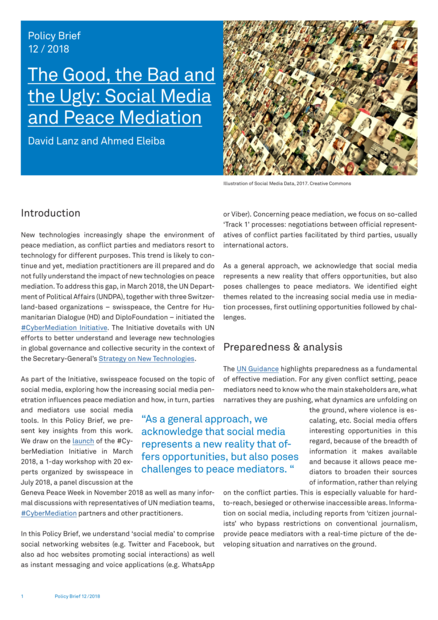 "The spread of social media has an increasing impact on peace mediation. It complicates mediators’ efforts to provide a confidential negotiation space. It also provides opportunities for public communication and consultations, allowing peace mediators to engage with audiences that were previously out of reach. It also changes the way conflict parties act, the narratives they advance and in some cases the way they fight wars. It is important for mediators to be aware of these dynamics and to prepare accordingly. Despite the changes, social media are unlikely to revolutionize peace mediation. Present and future, just like in the past, it essentially remains a human-driven activity. Peace mediators engage with parties, building trust between them and helping them reach mutually acceptable agreements in situations when developments in the military and political context allow for it." (Conclusion, page 4)