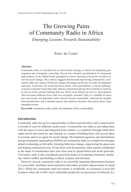 "Community radio is considered as an intervention strategy of choice for deepening participation and community ownership. Donors have funded a proliferation of community radio projects in the Global South, prompted by stories attesting to the power of radio as a tool for social change. The evidence suggests that beyond empowering communities, community radio can catalyse behaviour change and impact positively on wider development outcomes. In practice, the record has been mixed, with sustainability a critical challenge. A recent evaluation found that radio stations created through top-down initiatives tend not to survive when external funding dries up. Where such stations do survive, their purpose often becomes different from what was originally intended. Only in a handful of cases have previously aid-dependent radio stations become sustainable. Informed by insights from practitioners, and evaluation reports and scholarly literature, this article draws some emerging lessons." (Abstract)