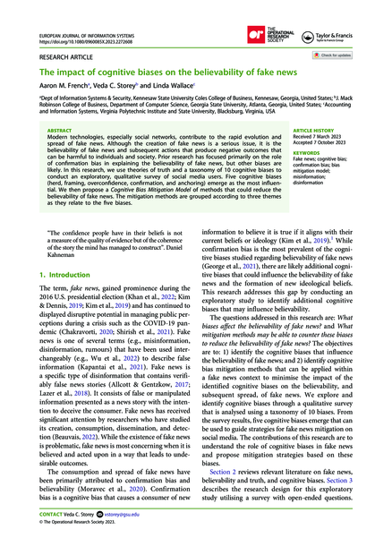 "Modern technologies, especially social networks, contribute to the rapid evolution and spread of fake news. Although the creation of fake news is a serious issue, it is the believability of fake news and subsequent actions that produce negative outcomes that can be harmful to individuals and society. Prior research has focused primarily on the role of confirmation bias in explaining the believability of fake news, but other biases are likely. In this research, we use theories of truth and a taxonomy of 10 cognitive biases to conduct an exploratory, qualitative survey of social media users. Five cognitive biases (herd, framing, overconfidence, confirmation, and anchoring) emerge as the most influential. We then propose a Cognitive Bias Mitigation Model of methods that could reduce the believability of fake news. The mitigation methods are grouped according to three themes as they relate to the five biases." (Abstract)