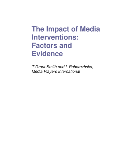 "In this paper we will be looking at the evidence of impact from interventions in the so-called ‘traditional’ media – TV, radio and, to a much lesser extent, print – and factors contributing to that impact. By ‘media interventions’ we mean using mass-media in support of development objectives and as part of development projects to help bring about behaviour change – for instance, the use of TV/radio spots (also known as PSAs – public service announcements) to promote condom use, or radio programmes to promote better agricultural practices. This should not be confused with so-called ‘media development’, which aims to create independent and professional media, recognising the potential of the media as an important independent agent of social and political change, for example in governance." (Introduction)