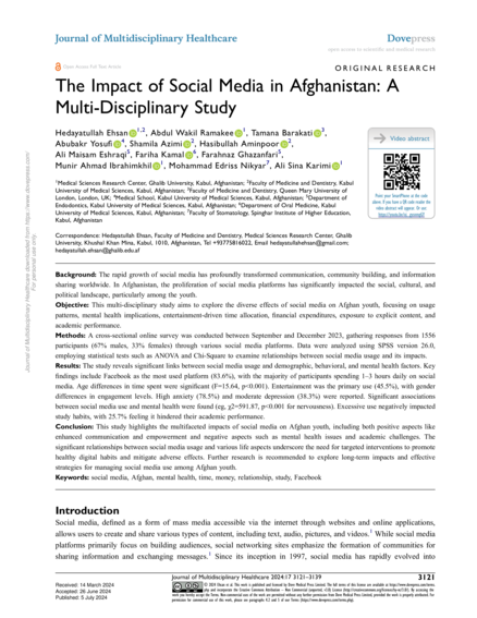 "This multi-disciplinary study aims to explore the diverse effects of social media on Afghan youth, focusing on usage patterns, mental health implications, entertainment-driven time allocation, financial expenditures, exposure to explicit content, and academic performance. Methods: A cross-sectional online survey was conducted between September and December 2023, gathering responses from 1556 participants (67% males, 33% females) through various social media platforms. Data were analyzed using SPSS version 26.0, employing statistical tests such as ANOVA and Chi-Square to examine relationships between social media usage and its impacts. Results: The study reveals significant links between social media usage and demographic, behavioral, and mental health factors. Key findings include Facebook as the most used platform (83.6%), with the majority of participants spending 1–3 hours daily on social media. Age differences in time spent were significant (F=15.64, p<0.001). Entertainment was the primary use (45.5%), with gender differences in engagement levels. High anxiety (78.5%) and moderate depression (38.3%) were reported. Significant associations between social media use and mental health were found (eg, x2=591.87, p<0.001 for nervousness). Excessive use negatively impacted study habits, with 25.7% feeling it hindered their academic performance. Conclusion: This study highlights the multifaceted impacts of social media on Afghan youth, including both positive aspects like enhanced communication and empowerment and negative aspects such as mental health issues and academic challenges. The significant relationships between social media usage and various life aspects underscore the need for targeted interventions to promote healthy digital habits and mitigate adverse effects. Further research is recommended to explore long-term impacts and effective strategies for managing social media use among Afghan youth." (Abstract)