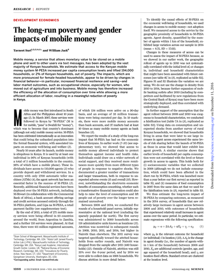 "Mobile money, a service that allows monetary value to be stored on a mobile phone and sent to other users via text messages, has been adopted by the vast majority of Kenyan households. We estimate that access to the Kenyan mobile money system M-PESA increased per capita consumption levels and lifted 194,000 households, or 2% of Kenyan households, out of poverty. The impacts, which are more pronounced for female-headed households, appear to be driven by changes in financial behavior—in particular, increased financial resilience and saving—and labor market outcomes, such as occupational choice, especially for women, who moved out of agriculture and into business. Mobile money has therefore increased the efficiency of the allocation of consumption over time while allowing a more efficient allocation of labor, resulting in a meaningful reduction of poverty in Kenya." (Abstract)