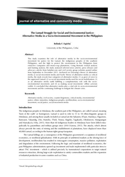 "This study examines the role of alternative media in the socio-environmental movement for justice for the Lumad, the indigenous peoples of the southern Philippines, and the fight to protect the environment in the Philippines from extractive companies and mono-crop plantations. Using thematic textual analysis and framing analysis, the study analysed selected news articles, press releases and advocacy articles from bulatlat.com and civil society group websites posted online from September to December 2015. Anchored on Downing’s theory of alternative media as social movement media and Fuchs’ theory of alternative media as critical media, the study reveals four categories of alternative media: (1) as giver of voice to the oppressed Lumad; (2) as social movement media used for social mobilisation; (3) as an alternative media outfit fulfilling a complementary role with the socioenvironmental movement; and (4) as making social movements’ offline activism visible. It concluded that alternative media play a vital role in socio-environmental movements and the continuing challenge to mitigate the climate crisis." (Abstract)