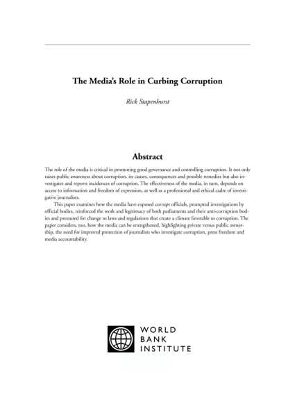 "This paper examines how the media have exposed corrupt officials, prompted investigations by official bodies, reinforced the work and legitimacy of both parliaments and their anti-corruption bodies and pressured for change to laws and regulations that create a climate favorable to corruption. The paper considers, too, how the media can be strengthened, highlighting private versus public ownership, the need for improved protection of journalists who investigate corruption, press freedom and media accountability." (Abstract)