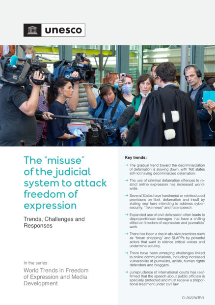 "The gradual trend toward the decriminalization of defamation is slowing down, with 160 states still not having decriminalized defamation. The use of criminal defamation offences to restrict online expression has increased worldwide. Several States have harshened or reintroduced provisions on libel, defamation and insult by stating new laws intending to address cybersecurity, 'fake news' and hate speech. Expanded use of civil defamation often leads to disproportionate damages that have a chilling effect on freedom of expression and journalists' work. There has been a rise in abusive practices such as 'forum shopping' and SLAPPs by powerful actors that want to silence critical voices and undermine scrutiny. There have been emerging challenges linked to online communications, including increased vulnerability of journalists, artists, human rights defenders and bloggers. Jurisprudence of international courts has reaffirmed that the speech about public officials is specially protected and must receive a proportional treatment under civil law." (Key trends)