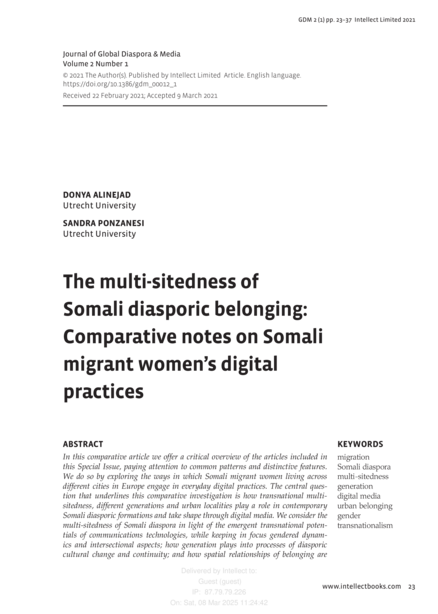 "In this comparative article we offer a critical overview of the articles included in this Special Issue, paying attention to common patterns and distinctive features. We do so by exploring the ways in which Somali migrant women living across different cities in Europe engage in everyday digital practices. The central question that underlines this comparative investigation is how transnational multisitedness, different generations and urban localities play a role in contemporary Somali diasporic formations and take shape through digital media. We consider the multi-sitedness of Somali diaspora in light of the emergent transnational potentials of communications technologies, while keeping in focus gendered dynamics and intersectional aspects; how generation plays into processes of diasporic cultural change and continuity; and how spatial relationships of belonging are shaped by the communicative spaces that mobile devices and software platforms afford. Our findings show that to better understand the role of digitally mediated experiences, we need to focus on everyday media environments within contexts of international mobility across continental borders marked by postcolonial traces." (Abstract)