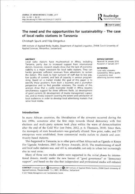 "Local radio stations have mushroomed in Africa, including Tanzania, partly due to increased support from international donors. However, research results show that the lack of economic viability is a major constraint for local radio stations. They can hardly generate sufficient revenues from advertisers to sustain the station. This leads to high turnover of staff due to low pay, low quality of content, and lack of capacity in serious programming. Based on a market model, the goal of this paper is to identify these problems from both a business and a journalism perspective and to find possible solutions. The results of this analysis show that a viable economic model in Africa requires simultaneous support for three different fields, (a) development of good content, (b) development of media management capacities, and (c) media research covering the extent and satisfaction of local audiences in order to develop local advertising markets that serve local media." (Abstract)