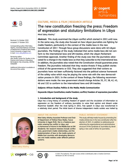 "This study examined the Libyan conflict which started in 2011 until now. In the same way, the study also focused on how Libyan journalists are fighting for media freedom, particularly in the context of the media laws in the new Constitution of 2017. Through focus group discussions were done with 40 Libyan journalists. The findings of the study indicated that some media laws did not conform to the international laws and UN treaties, which the Libyan Parliament Committee approved. Another finding of the study was that the journalists advocated for a change in the media laws so that they subscribe to the international law. In addition, the journalists also noted that the Constitution should guarantee press freedom. The journalists indicated that they receive threats if they publish stories critical of the governments or ISIS. They also suggested that their actions as journalists have not been sufficiently factored into the political science framework of the safety valve which may be playing the same role with the new democratisation process in 2021. In the context of these findings, the following recommendations were made: the new government should change Articles 35, 37, 38, 42, 43, 46 and 132 to conform to the international laws and UN treaties." (Abstract)