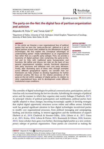 "In this article we theorize a new organizational face of political parties that we term the ‘party-on-the-net’, defined as a set of digital partisan activist roles enabled by the affordances of digital technologies. We first explain the conceptual advantages of understanding parties’ media hybridization as an organizational face rather than as a specific party subtype. Then, we provide a taxonomy of digital partisan roles comprising the party-on-thenet and its links with traditional party bureaucracies and functions. We define and discuss ten roles on the basis of two general organizational variables, namely functional alignment with party structures and influence over core party decisions. Finally, after illustrating each of these roles through examples across different geographical regions, we consider how our framework can help scholars to develop hypotheses for further empirical scrutiny. We focus on the relative prevalence of the party-on-the-net within subtypes of digital parties, its relation to other organizational faces, and its development under different institutional scope conditions." (Abstract)