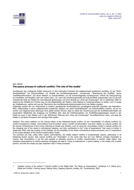 "This article explores (1) the cultural nature of the Palestinian-Israeli conflict; (2) the "intractability" of cultural conflicts; (3) conflict management models: reconciliation/"end-of-conflict" versus "conflict transformation" and their relation to cultural conflict; (4) the serious consequences of the wrong matching of models and conflicts, such as using the reconciliation model in cultural conflict; (5) the changing role of the media in international relations, and their contribution to the "crisis of expectations" that came to fruition in September 2000, with the eruption of the Intifada; (6) the possibility of the media contributing to peace processes; and (7) implications of the media adoption of the conflict transformation model. The premises are that, unlike other violent confrontations, the Middle Eastern conflict is fundamentally cultural, particularly in its Palestinian-Israeli version; that cultural conflicts are "intractable" (Lederach, 1998; Burgess&Burgess, 1996; Kraybill, 1995), in the sense that they are very difficult, perhaps impossible to resolve; that reconciliation is not the only possible or desirable outcome of conflict: transformation (Vayrynen, 1991) is another viable option; that mistaken interpretations of conflict-resolution strategies can lead to "crises of expectations" in policy-making, in the media, and in public opinion; and that the media can play important roles in these processes." (Abstract)