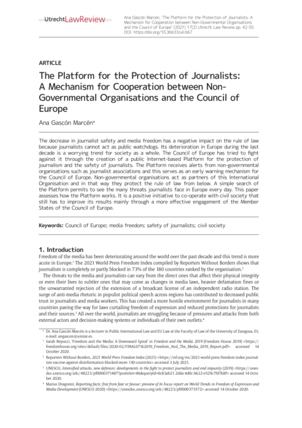 "The decrease in journalist safety and media freedom has a negative impact on the rule of law because journalists cannot act as public watchdogs. Its deterioration in Europe during the last decade is a worrying trend for society as a whole. The Council of Europe has tried to fight against it through the creation of a public Internet-based Platform for the protection of journalism and the safety of journalists. The Platform receives alerts from non-governmental organisations such as journalist associations and this serves as an early warning mechanism for the Council of Europe. Non-governmental organisations act as partners of this International Organisation and in that way they protect the rule of law from below. A simple search of the Platform permits to see the many threats journalists face in Europe every day. This paper assesses how the Platform works. It is a positive initiative to co-operate with civil society that still has to improve its results mainly through a more effective engagement of the Member States of the Council of Europe." (Abstract)